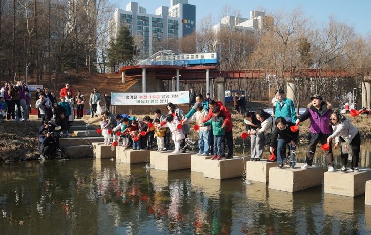연수구는 25일 승기천 연수체육공원 일대에서 주민, 자원봉사자, 관계기관, ‘1사1하천 가꾸기 운동’ 참여기업 등 200여 명이 참여한 가운데 ‘승기천 수질 1등급 달성 기념 환경정화 및 버들치 방류 행사’를 개최했다.