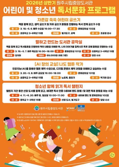 뉴한국방송뉴스통신사 양호선기자 기자 | 원주시립중앙도서관은 오는 3월부터 6월까지 ‘2026년 상반기 어린이 및 청소년 독서문화 프로그램’을 운영한다.