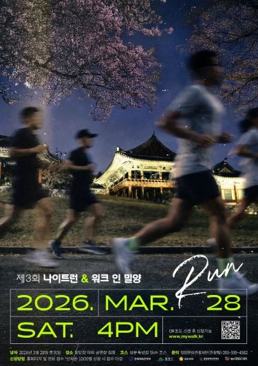 뉴한국방송뉴스통신사 신유철기자 기자 | 밀양문화관광재단은 오는 3월 28일 삼문동 밀양강 둔치 일원에서 벚꽃 철을 맞아 지역 야간관광 활성화를 위한 이색 러닝 축제 ‘제3회 나이트 런 앤 워크 인 밀양(Night Run & Walk in Miryang)’을 열고, 3월 22일까지 참가자를 모집한다.
