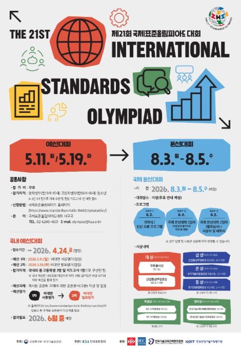 이번에 신청하는 중‧고교 학생들은 5월에 개최되는 국내 예선대회에 참가하며, 한국대표팀으로 선발된 학생들은 8월 한국에서 개최되는 본선대회에 참가하게 된다. 특히, 올해 대회에는 국제표준 경진대회와 문화교류 행사 이외에도 모의 국제표준화회의 프로그램이 추가되어 표준 전문가들이 활동하는 국제 무대를 경험할 수 있을것으로 기대된다.