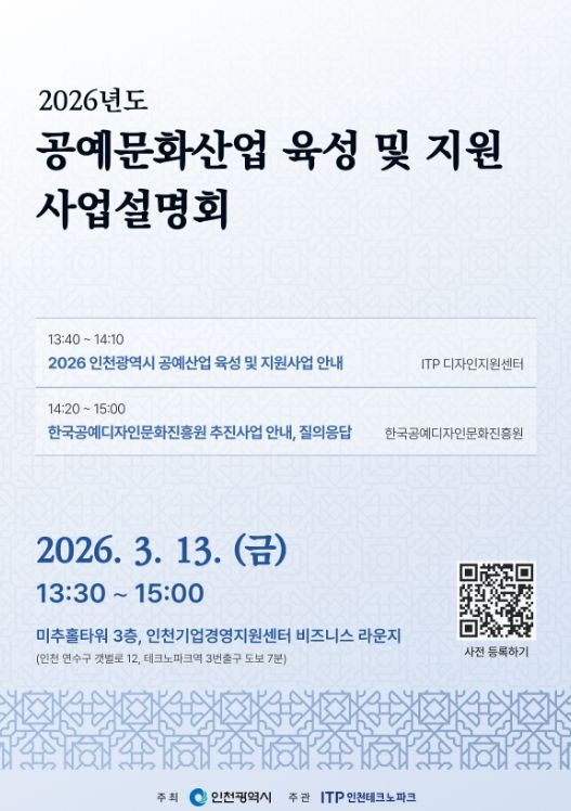 이번 설명회는 인천광역시가 주최하고 인천TP가 주관한다. 지역 공예기업 및 공예인 등을 대상으로 2026년도 공예산업 지원사업의 추진 방향과 세부 내용을 공유하기 위해 마련됐다.