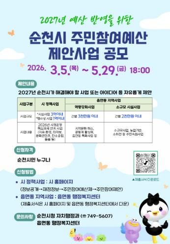 뉴한국방송뉴스통신사 신다은기자 기자 | 순천시는 2027년도 예산편성 과정에 시민의 다양한 의견과 아이디어를 반영하기 위해 3월부터 5월까지 주민참여예산 제안사업을 접수한다고 밝혔다.