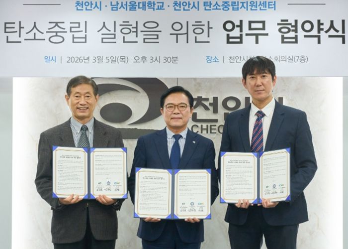 뉴한국방송뉴스통신사 신태공 기자 | 천안시는 5일 시청 제1소회의실에서 남서울대학교, 천안시 탄소중립지원센터와 ‘탄소중립 시민 저변 확대를 위한 업무협약’을 체결했다고 밝혔다.