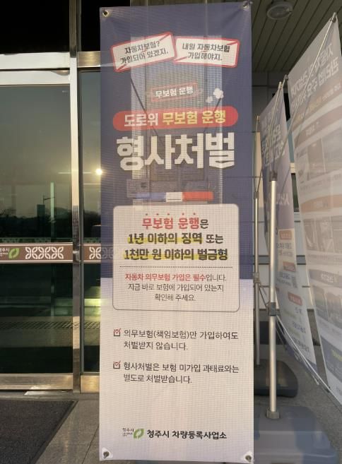 이에 청주시 차량등록사업소는 ‘무보험 운행은 형사처벌 대상’이라는 내용의 홍보 배너를 설치하고, 의무보험 가입 안내문을 제작·배부하는 등 시민 홍보를 강화하며 무보험 운행 근절과 재발 방지에 힘쓰고 있다.