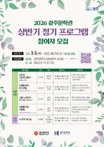 뉴한국방송뉴스통신사 김성의 기자 | 광주광역시는 시민의 문학적 감수성과 창작 역량을 키우기 위해 ‘2026년 광주문학관 상반기 정기 프로그램’을 운영한다.