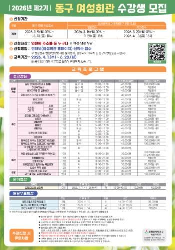 뉴한국방송뉴스통신사 신유철기자 기자 | 인천 동구는 오는 3월 9일~4월 3일까지‘2026년 제2기 동구 여성회관’ 수강생을 모집한다고 밝혔다.