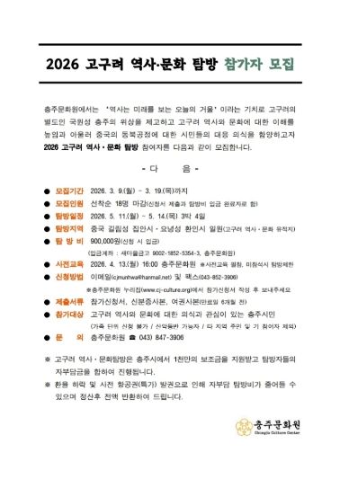 참가 희망자는 3월 19일까지 충주문화원 누리집에서 신청서를 내려받아 이메일 또는 팩스로 제출하면 된다.