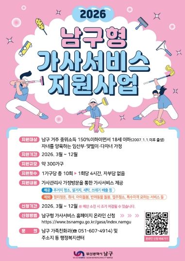 뉴한국방송뉴스통신사 신유철기자 기자 | 부산 남구는 임산부·맞벌이·다자녀 가정의 가사 부담을 완화하기 위해 '2026년 남구형 가사서비스 지원사업'을 3월 9일부터 시행한다고 밝혔다.
