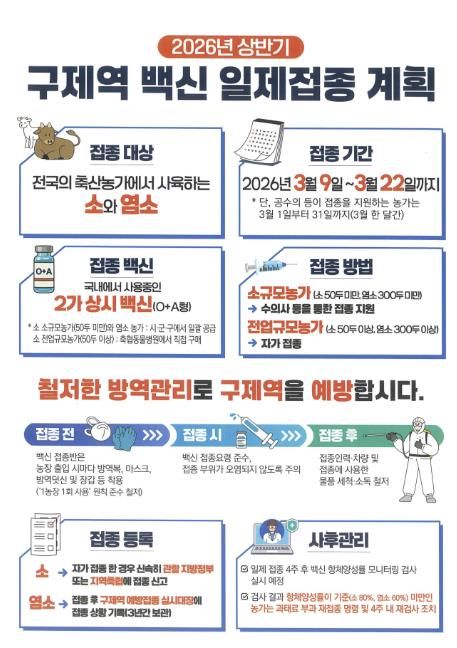 뉴한국방송뉴스통신사 양호선기자 기자 | 홍천군은 구제역 유입 방지와 완전 차단을 위해 상반기 구제역 일제 백신접종을 실시한다. 대상은 1,001 농가 36,830두(소 928 농가 33,566두, 염소 73 농가 3,264두) 사육 농가이다.