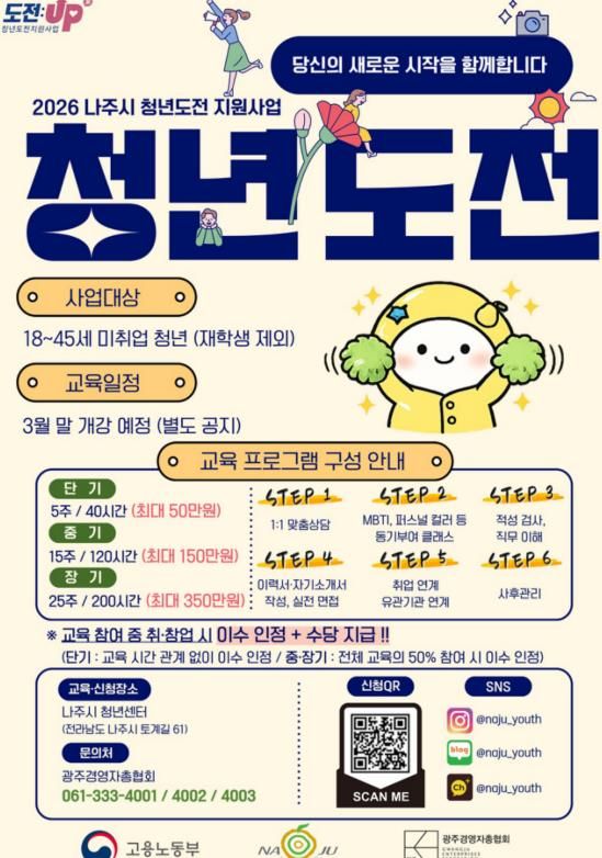뉴한국방송뉴스통신사 신다은기자 기자 | 전남 나주시는 구직 활동에 어려움을 겪는 청년들의 취업 의욕을 높이고 사회 진출을 돕기 위해 맞춤형 취업역량 프로그램인 ‘청년도전지원사업’ 참여자를 모집한다고 6일 밝혔다.