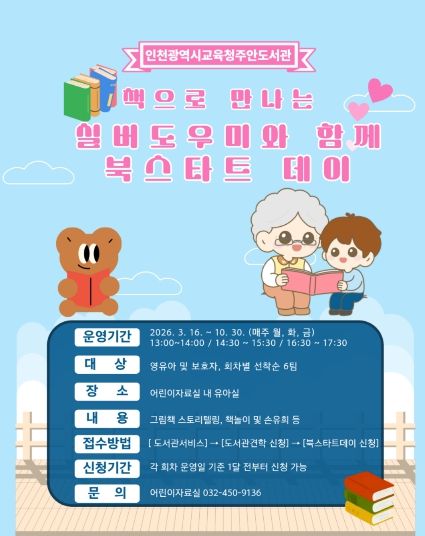 뉴한국방송뉴스통신사 신유철기자 기자 | 인천광역시교육청주안도서관은 오는 3월 16일부터 10월 30일까지 영유아 및 보호자를 대상으로 ‘책으로 만나는 실버도우미와 함께 북스타트 데이’를 운영한다.