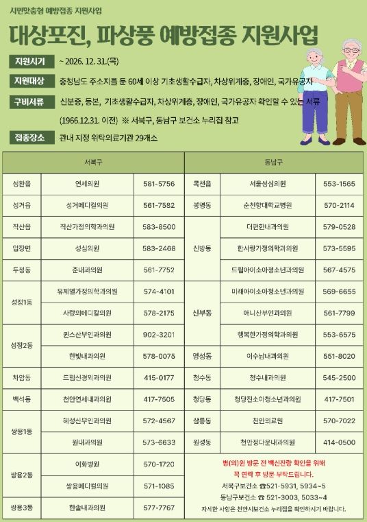 충남도에 주소를 둔 도민이면 내달 1일부터 천안시 서북구·동남구보건소 및 관내 위탁의료기관에서 무료로 예방접종을 받을 수 있다.