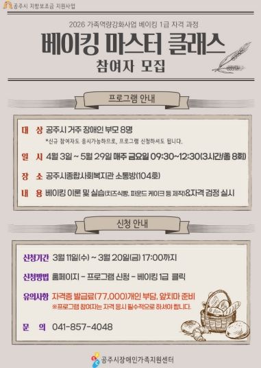 뉴한국방송뉴스통신사 신태공 기자 | 공주시장애인가족지원센터(센터장 이영식)는 오는 3월 20일까지 장애인 부모를 대상으로 베이킹 1급 자격 과정인 ‘베이킹 마스터 클래스’ 참여자를 모집한다고 밝혔다.