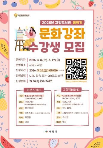 뉴한국방송뉴스통신사 신태공 기자 | 대전 동구는 ‘2026년 자양도서관 봄학기 문화강좌’를 운영하며, 이달 16일부터 동구 공공도서관 누리집을 통해 수강생을 선착순 모집한다고 밝혔다.