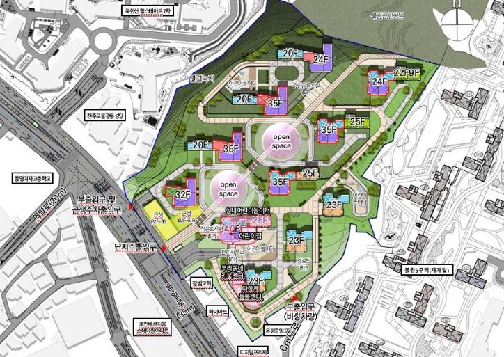 대상지는 3호선 불광역에 인접해 대중교통의 접근성이 우수하고, 불광근린공원 등 주변 녹지와도 가까워 쾌적한 주거환경을 누릴 수 있다.
