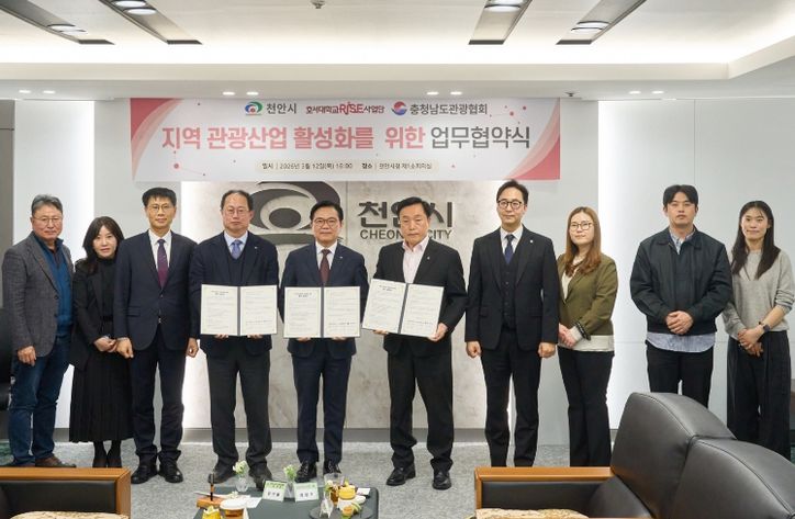 천안시는 12일 시청 제1소회의실에서 호서대학교 RISE사업단, 충남관광협회와 ‘지역 관광산업 활성화를 위한 업무협약’을 체결했다.