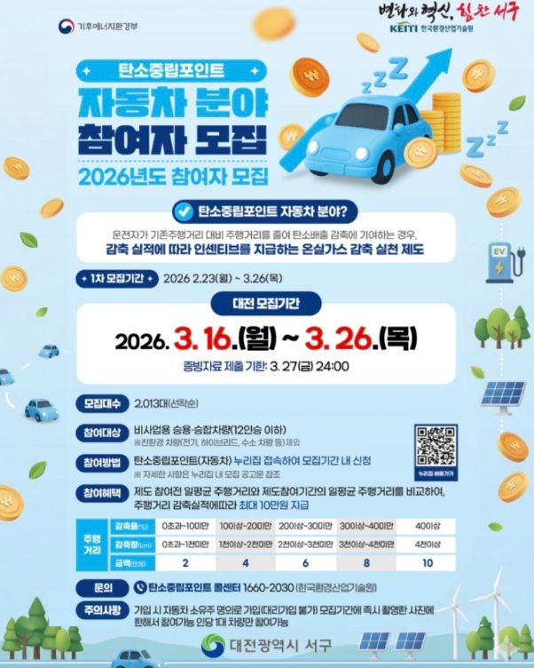 뉴한국방송뉴스통신사 신태공 기자 | 대전 서구는 온실가스 감축을 위해 3월 16일부터 26일까지 2026년 자동차 탄소중립포인트제 참여자를 모집한다고 13일 밝혔다.