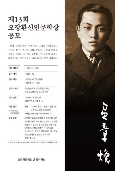뉴한국방송뉴스통신사 권영분기자 기자 | 충북 보은군과 오장환 문학상 운영위원회는 한국 모더니즘과 리얼리즘, 아방가르드 시단의 선구자로 평가받는 오장환(1918~1951) 시인의 문학 정신을 기리고 유망한 신인 시인을 발굴하기 위해 ‘제13회 오장환 신인문학상’ 작품을 공모한다.