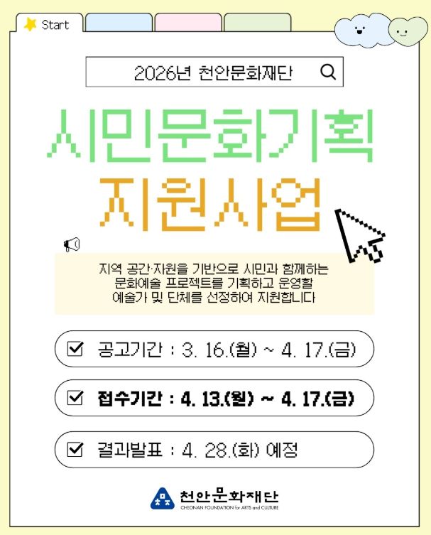뉴한국방송뉴스통신사 신태공 기자 | 천안문화재단은 내달 13~ 17일 ‘시민문화기획 지원사업’ 참여 예술가를 모집한다고 16일 밝혔다.