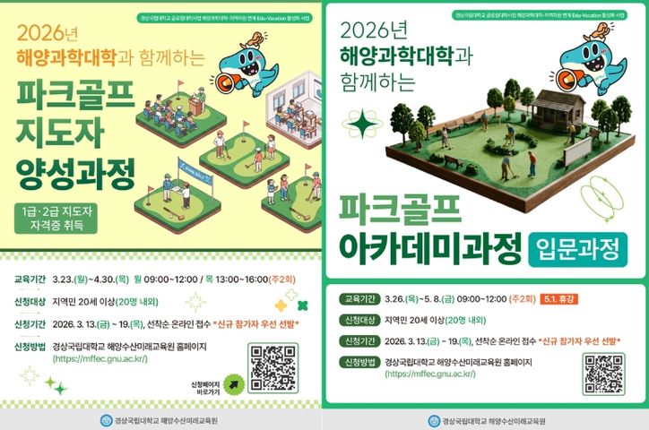 뉴한국방송뉴스통신사 신유철기자 기자 | 경상국립대학교 해양과학대학 해양수산미래교육원은 3월 23일부터 ‘파크골프 지도자 양성과정(1급·2급 지도자 자격증 취득) 및 파크골프 아카데미’ 2개 과정을 운영한다.