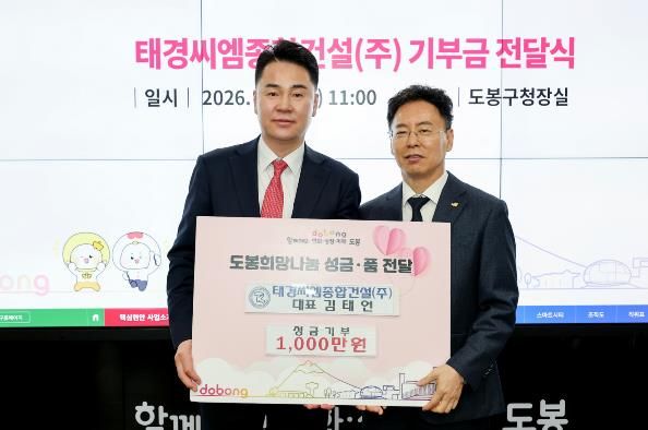 뉴한국방송뉴스통신사 신유철기자 기자 | 서울 도봉구가 지난 3월 9일 태경씨엠종합건설(주) 김태언 대표로부터 성금 1천만 원을 기부받았다고 밝혔다. 성금은 지역 내 도움이 필요한 이웃들에게 전달될 예정이다.