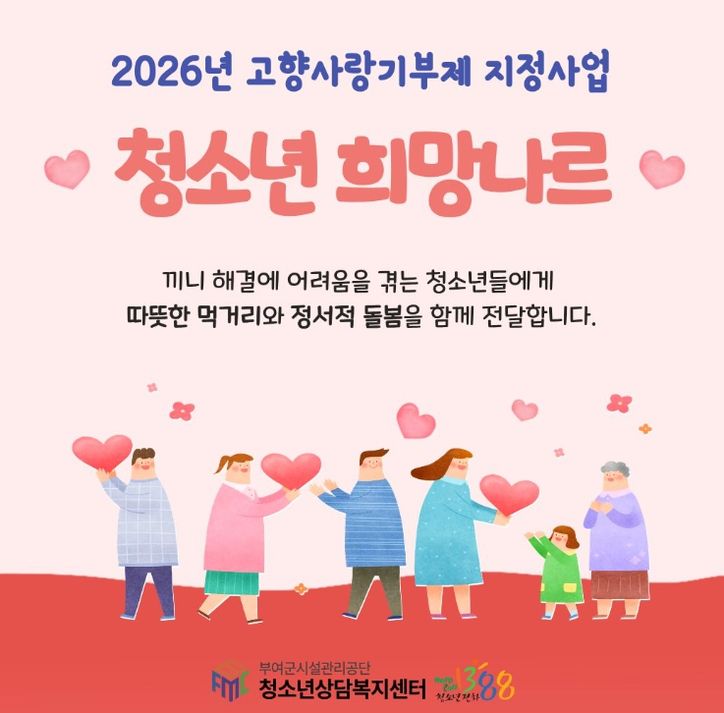 뉴한국방송뉴스통신사 신태공 기자 | 부여군시설관리공단 부여군청소년상담복지센터는 지역사회 기부금을 활용하여 돌봄 사각지대 청소년을 지원하는 고향사랑기부제 지정사업 '청소년 희망나르'를 추진한다고 밝혔다.