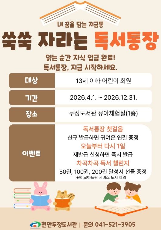 뉴한국방송뉴스통신사 신태공 기자 | 천안시 두정도서관은 내달부터 어린이들의 독서습관 형성을 위한‘쑥쑥 자라는 독서통장’프로그램을 운영한다고 18일 밝혔다.