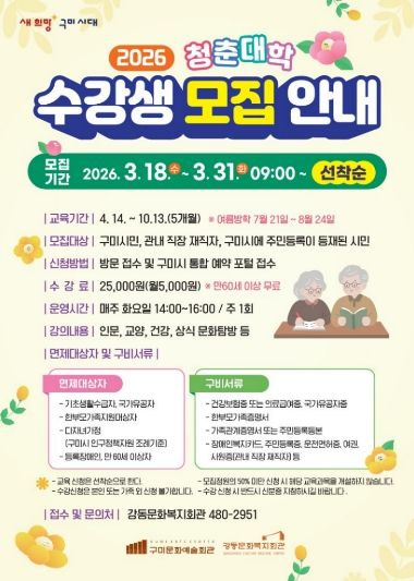 올해로 8회째를 맞는 청춘대학은 계절별 구미여행, 시립합창단·시립무용단과 함께하는 가곡교실 및 한국무용교실, AI(인공지능) 활용, 구미역사기행, 해설과 함께하는 클래식 산책, 중장년을 위한 자유여행 플래너, 마음을 어루만지는 힐링 컬러 테라피(미술치료), 구미의 종가고택 문화유산 탐구, 미술로 보는 세상, 미술이 바꾼 세상 등 다양한 신규 과정을 마련해 실용성과 흥미를 겸비한 배움의 기회를 제공한다.