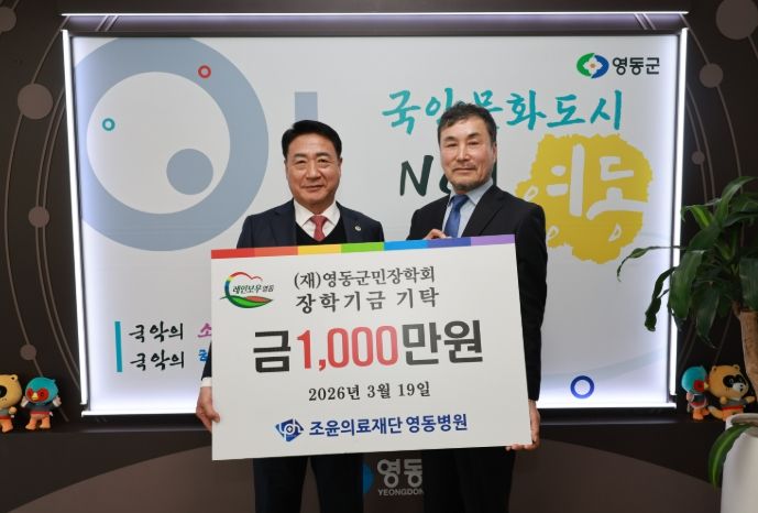 뉴한국방송뉴스통신사 권영분기자 기자 | 조윤의료재단 영동병원(이사장 윤왕영)은 19일 영동군청을 방문해 지역 미래 인재 육성을 위한 장학금 1,000만 원을 (재)영동군민장학회에 기탁했다.