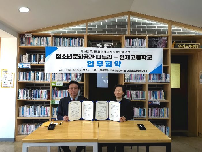 뉴한국방송뉴스통신사 신유철기자 기자 | 인천광역시교육청중앙도서관 청소년문화공간 다누리는 19일, 인제고등학교와 ‘청소년 독서문화 환경 조성 및 확산을 위한 업무협약’을 체결했다.