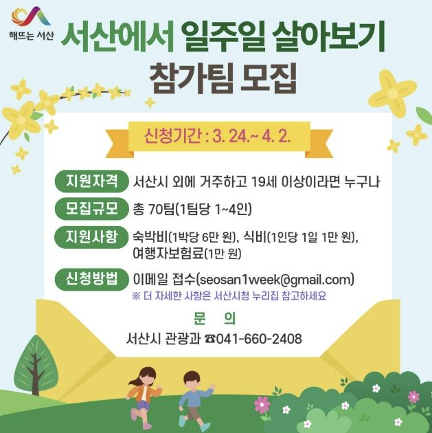 뉴한국방송뉴스통신사 신태공 기자 | 충남 서산시가 3월 24일부터 4월 2일까지 ‘서산에서 일주일 살아보기’ 참가팀을 모집한다고 밝혔다.