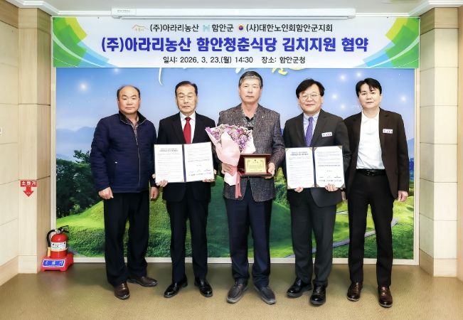 뉴한국방송뉴스통신사 신유철기자 기자 | 함안군은 지난 23일 ㈜아라리농산과 (사)대한노인회 함안군지회가 함안청춘식당 이용 어르신들의 건강한 식생활 지원을 위한 ‘사랑의 김치 후원 협약’을 체결했다고 밝혔다.