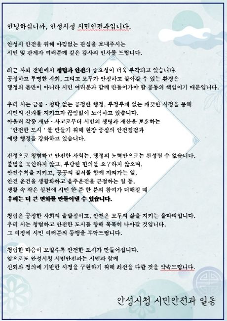 뉴한국방송뉴스통신사 신유철기자 기자 | 안성시는 각종 안전점검 과정에서 청렴 안내문을 배부하는 ‘청렴한 안전점검’을 추진하며 시민 청렴의식 제고에 나선다.