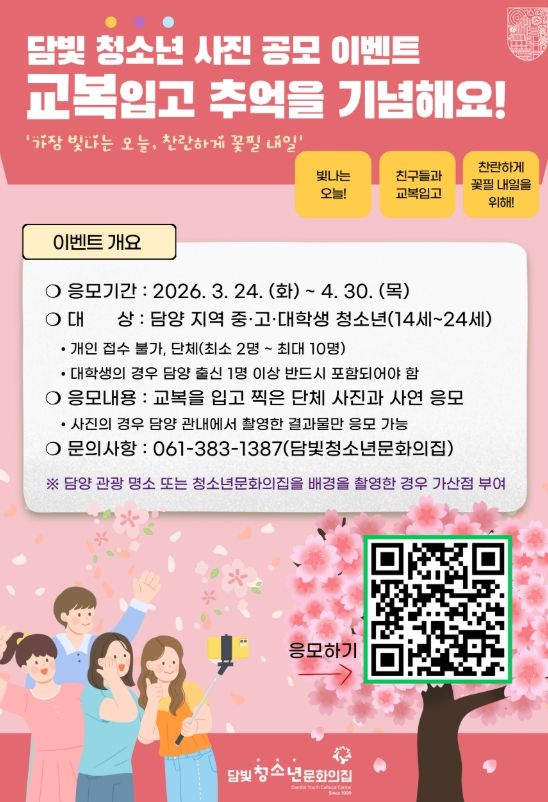 군 관계자는 “청소년들이 친구들과 함께 담양의 다양한 공간에서 사진을 촬영하며 지역의 매력을 자연스럽게 경험하길 바란다”며 “이번 공모전이 소중한 추억을 만들고 지역 문화를 기록하는 의미 있는 기회가 되길 기대한다”라고 전했다.