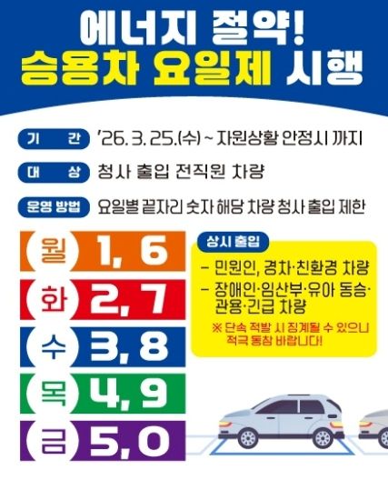 승용차 요일제는 청사에 출입하는 모든 차량을 대상으로 운영되며, 차량 번호 끝자리 숫자에 따라 해당 요일 청사 출입이 제한된다. 요일별 적용 기준은 ▲월요일 1·6 ▲화요일 2·7 ▲수요일 3·8 ▲목요일 4·9 ▲금요일 5·0이다.