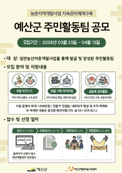 뉴한국방송뉴스통신사 신태공 기자 | 예산군행복마을지원센터는 주민의 지역개발사업 참여를 확대하고 주민활동팀의 자립체계 구축을 지원하기 위해 ‘농촌지역개발사업 지속관리체계 구축’ 주민활동팀을 4월 13일까지 모집한다고 밝혔다.