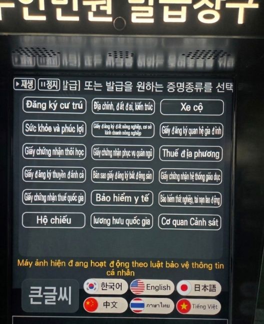 이 서비스는 화면 안내를 번역해 주는 편의 기능으로, 행정 시스템에 지문 등 주민 정보가 등록된 사람(한국 국적 취득자 등)에 한해서만 이용할 수 있다.