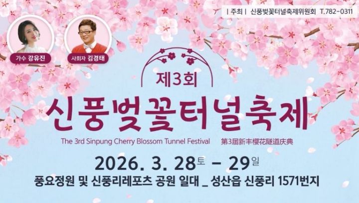 뉴한국방송뉴스통신사 신유철기자 기자 | 서귀포시는 몸과 마음이 가벼워지는 따스한 봄, 가족・연인・친구 간의 잊지 못할 추억을 선사할 제3회 신풍벚꽃터널축제가 28일~29일 양일간 성산읍 풍요정원 및 신풍리레포츠 공원 일원에서 개최된다고 밝혔다.