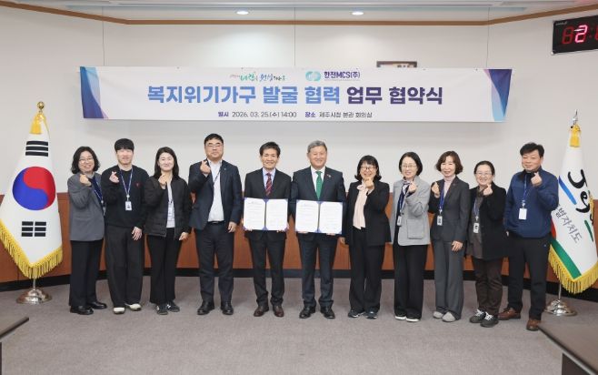뉴한국방송뉴스통신사 신유철기자 기자 | 제주시는 3월 25일 시청 본관 회의실에서 한전MCS 제주지사(지사장 황성태)와 ‘복지위기가구 발굴 협력’ 업무 협약을 체결했다.