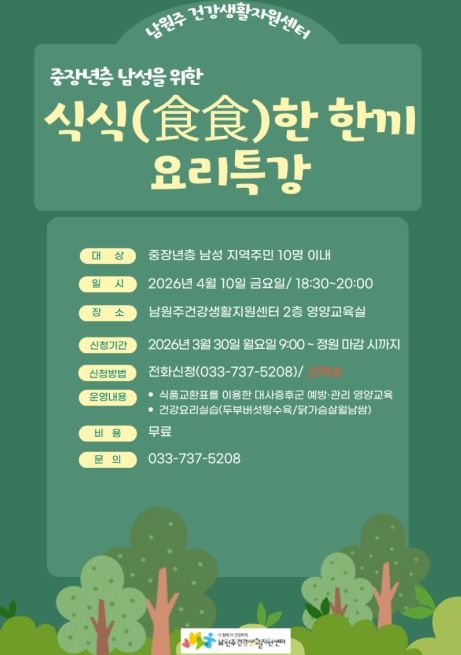 뉴한국방송뉴스통신사 양호선기자 기자 | 남원주건강생활지원센터는 영양 교육 및 건강 요리 실습 기회가 적은 중장년 남성을 위한 ‘식식(食食)한 한끼’ 프로그램 참여자를 모집한다.