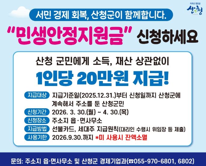 대상은 2025년 12월 31일부터 신청일까지 산청군에 계속해서 주민등록을 두고 있는 군민으로 1인당 20만원 선불카드 형태로 지급한다.