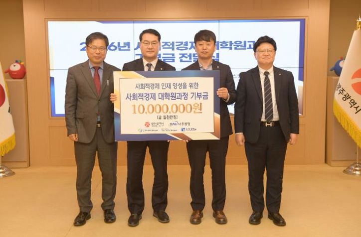 광주광역시는 27일 시청 비즈니스룸에서 ‘사회적경제 대학원과정 지원사업 기부금 전달식’을 열어 다우환경 이정일 대표로부터 기부금 1000만원을 전달받았다.