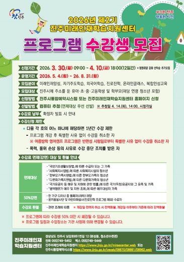 모집 및 프로그램에 관한 자세한 사항은 진주미래인재학습지원센터 누리집을 참고하거나 전화로 문의하면 된다.