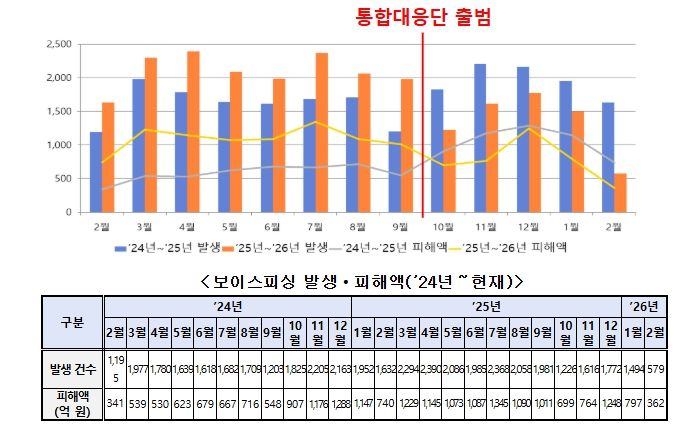 특히, 보이스피싱은 통상적으로 매년 4분기에 이전 분기보다 크게 증가하는 경향이 있었으나(’24년 ㅿ3분기 4,594건 → ㅿ4분기 6,193건, 34.8%↑), 통합대응단이 출범한 ’25년 4분기에는 오히려 이전 3분기보다 27.9% 감소(’25년 ㅿ3분기 6,407건 → ㅿ4분기 4,614건) 하여 ‘연말 피싱 특수’를 처음으로 억제했으며, 통합대응단 체계가 안착한 ’26년 2월에는 전년 동월 대비 발생 건수가 무려 64.5%(1,632건→579건) 감소했다.