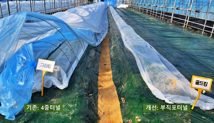 두 번째는 기존 피복 비닐을 걷어내지 않고 2기작에 그대로 활용하는 '무경운 재배'의 도입이다. 초기 생육은 다소 지연될 수 있으나 후반기에는 온전히 회복되어 관행 재배와 과실 품질 면에서 큰 차이가 없다. 이는 비닐 구입비를 덜어줄 뿐만 아니라 경운 작업에 소요되는 유류비까지 감축할 수 있어 농가 경영 혁신에 매우 효과적이다.