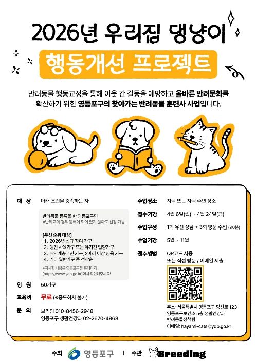 영등포구 생활건강과장은 “다양한 반려동물 프로그램 운영으로 성숙한 반려문화를 조성하겠다”라며, “사람과 반려동물이 함께 살기 좋은 영등포가 될 수 있도록 노력하겠다”라고 전했다.