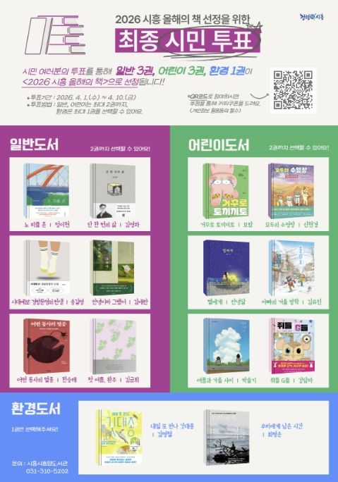 이번 시민 투표는 일반 6권, 어린이 6권, 환경 2권 등 총 14권을 대상으로 진행되며, 투표 결과를 반영해 최종 7권(일반 3권, 어린이 3권, 환경 1권)이 ‘2026 시흥 올해의 책’으로 선정된다.