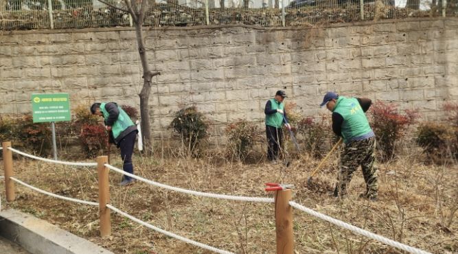 이번 활동에는 협의회 회원 9명이 자발적으로 참여해 이른 아침부터 정원 전반을 점검하며 겨우내 쌓인 낙엽과 잔여물을 정리하고 주변 환경을 정돈했다. 특히 수국의 건강한 생육을 돕기 위한 토양 정비와 화단 정리에 집중해, 개화시기에 한층 풍성한 경관을 조성할 수 있는 기반을 마련했다.