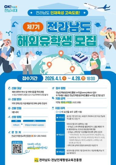 뉴한국방송뉴스통신사 신다은기자 기자 | 전라남도와 전남인재평생교육진흥원은 글로벌 핵심 인재 육성을 위해 세계 명문대 유학 기회를 제공하는 ‘제7기 전라남도 해외유학생’을 오는 28일까지 모집한다고 밝혔다.