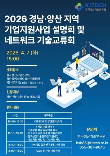 뉴한국방송뉴스통신사 신유철기자 기자 | 양산시는 오는 7일 한국생산기술연구원 첨단하이브리드생산기술센터 세미나실에서 지역 산업 발전 촉진과 관내 제조기업의 기술 혁신을 도모하기 위해 ‘2026년 기업지원사업 설명회 및 네트워크 기술교류회’를 개최한다고 밝혔다.